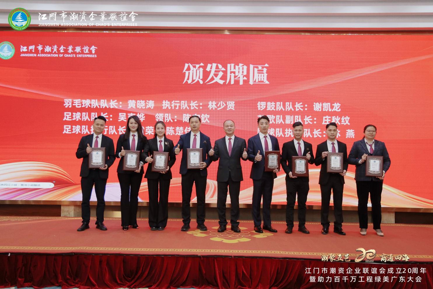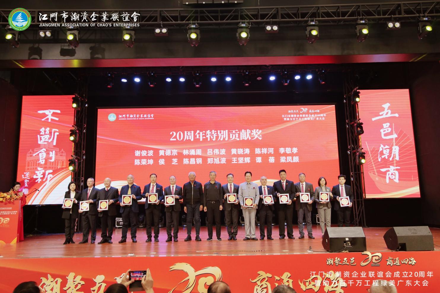 Zhen Renwang, miembro del grupo dirigente del Partido y subdirector del Comité Permanente del Congreso Popular Municipal de Jiangmen, entregó el 'Premio a la Contribución del 20º Aniversario' al vicepresidente Huang Xiaotao y otros miembros destacados de la asociación.