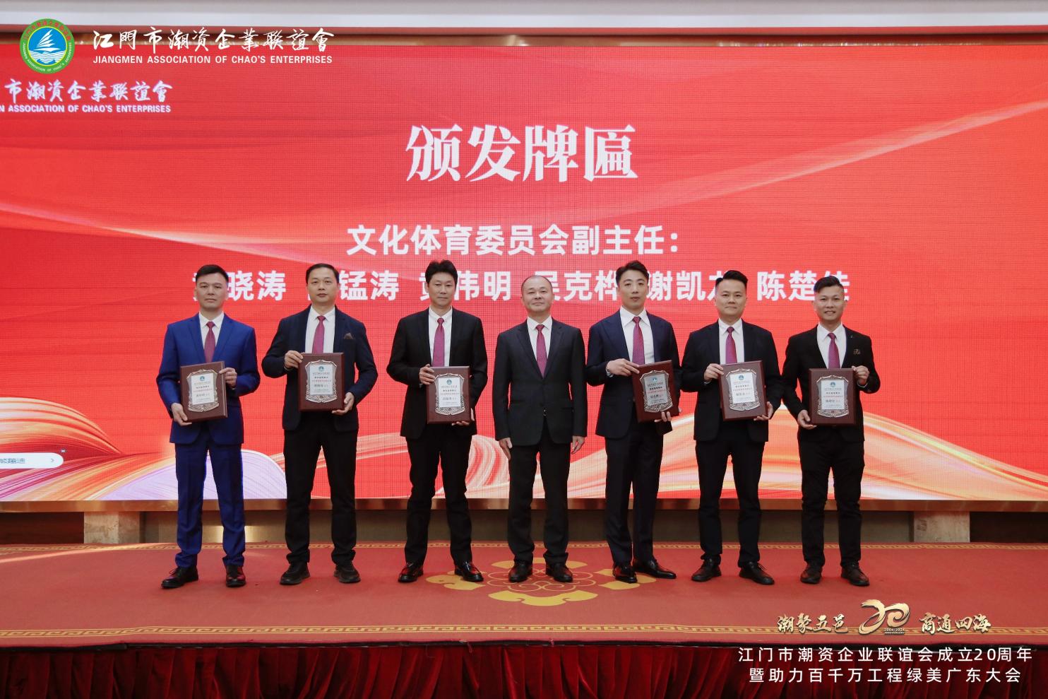 Zhao Jiyao, ex presidente del Comité Municipal de Jiangmen de la Conferencia Consultiva Política del Pueblo Chino, y Liang Qingzhao, ex subdirector ejecutivo del Comité Permanente del Congreso Popular Municipal de Jiangmen, presentaron el 'Premio a la Contribución Especial del 20º Aniversario' al vicepresidente Huang Xiaotao y otros miembros destacados de la asociación.