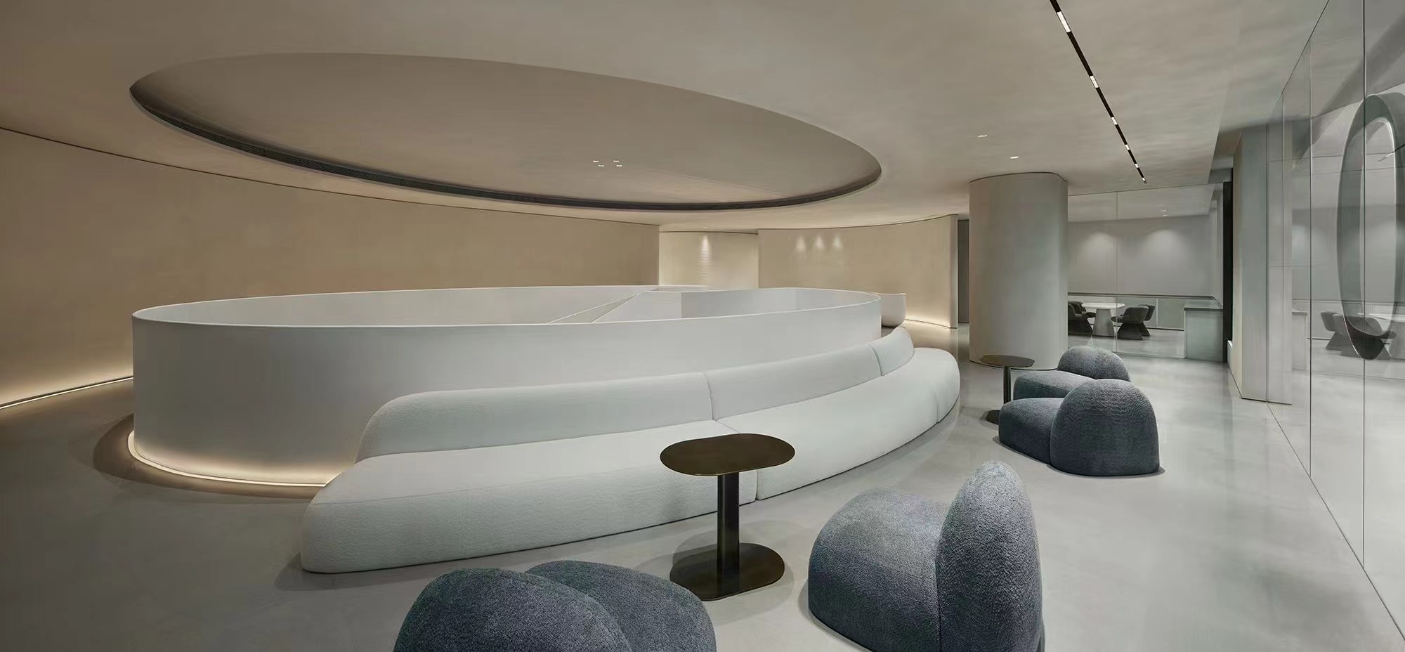 En el espacio, intente describir y representar cosas intangibles en el diseño, utilizando formas materiales para revelar el pensamiento cultural a nivel espiritual, dando forma a una atmósfera intangible que afecta el tacto, el olfato y el oído.El cerco es una forma interesante de espacio que no sólo define el mundo externo sino que también construye el mundo interno.Elimina la frontera entre el espacio médico y los pacientes y esta tranquilidad impregna cada detalle desde adentro hacia afuera, despertando nuestra conciencia del espacio.En la zona de espera hemos elegido suaves sofás con formas suaves para satisfacer las necesidades de comodidad de los usuarios y agregar una atmósfera más suave.No solo eso, la combinación cuidadosamente seleccionada de azul y blanco hace que toda la zona de espera luzca más fresca y luminosa, inyectando un toque de vitalidad al tranquilo espacio.La colisión del metal y la tela diluye el significado del proceso con emociones contenidas y es rica en expresión de transformación espiritual y material.